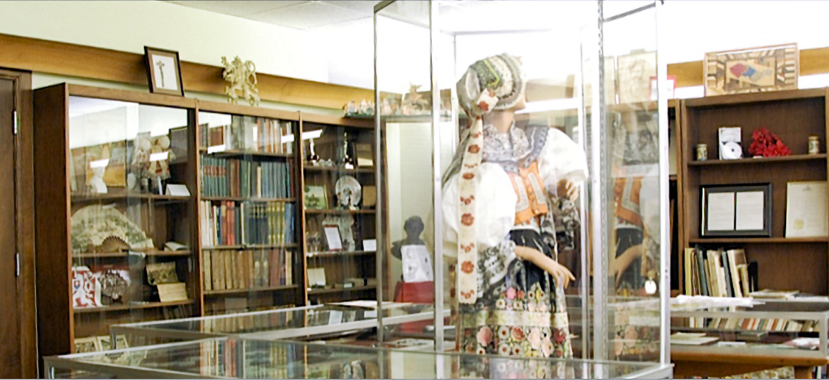 The Czech Heritage Room holds a large selection of books and displays on our Czech heritage, books written in Czech and books about the Czech Republic. The room holds Czech kroj calendars, embroidery patterns, textile and costume books that help with the research and kroj design for specific areas of the Czech Republic.